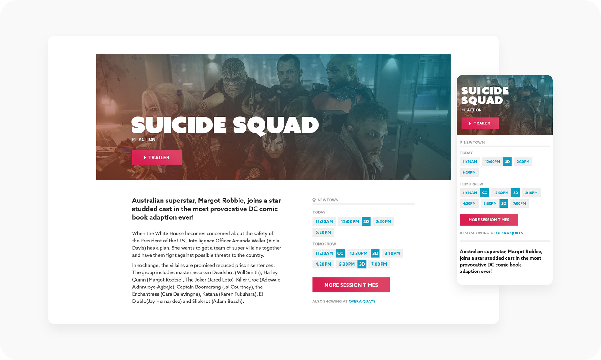 One of the main goals for the new website was to make booking as easy as possible. To help with this, we added a consistent CTA at the top of every page where a user could quickly view or search for movies.