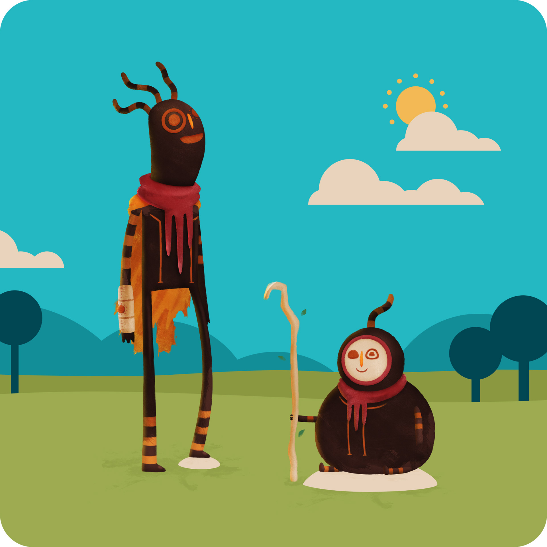 Originally, I tried a clean, flat type of background, to really help the characters and interactive objects stand out. But they didn't quite mesh. So I decided to make the backgrounds in the same style of the characters — in this earthy, textured, almost painterly style, which felt right for these characters and story.