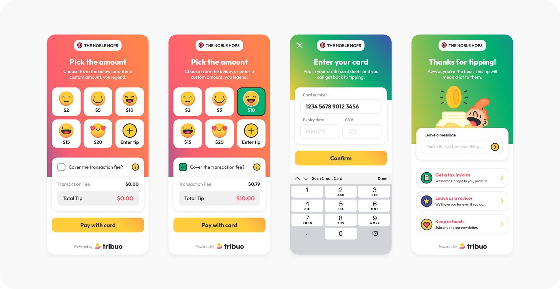 That's where Tribuo comes in — an honest cashless tipping and donating platform from right here in Australia. I worked on the overall branding and product design for the tipping flow, along with some illustrations.